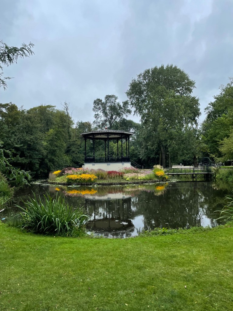 We left the museum around 12 and debated on whether to have lunch closer to the hotel or head out to one of the more famous parks where I’d read about **playgrounds AND cafes!**, the Vondelpark. Ultimately the promise of a playground won and we found our tram/started our trek. Here the weather really started to turn. Grey skies, misty rain, and temps in the low 60s… I won’t bore you with all the details but the one playground was maybe a bit too small for these boys (though they did have some fun) and the nearby cafe pretty limited in lunch options so we walked another 5 minutes to a place called Proeflokaal ‘t Blauwe Theehuis that I would recommend. No playground, but there’s a pizza bar on the upper level that looks out over the gardens. We didn’t actually eat up there but grabbed a bit at the outside picnic tables where we hoped for the rain to stop.