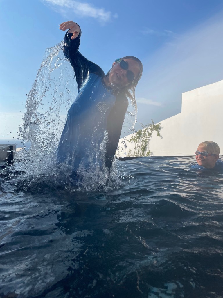 We arrived at our villa in Oia (pronounced “ee-ah”), near the north tip of the crescent shaped island, managed check in, and finally arrived to decompress. Josh immediately went to sleep in our room. The kids had a room downstairs this time and took off for their coveted iPad time. I handled some unpacking/dinner plans and then took in the incredible view right outside our bedroom. Despite the hectic and hard day, relaxing was going to come easy here.