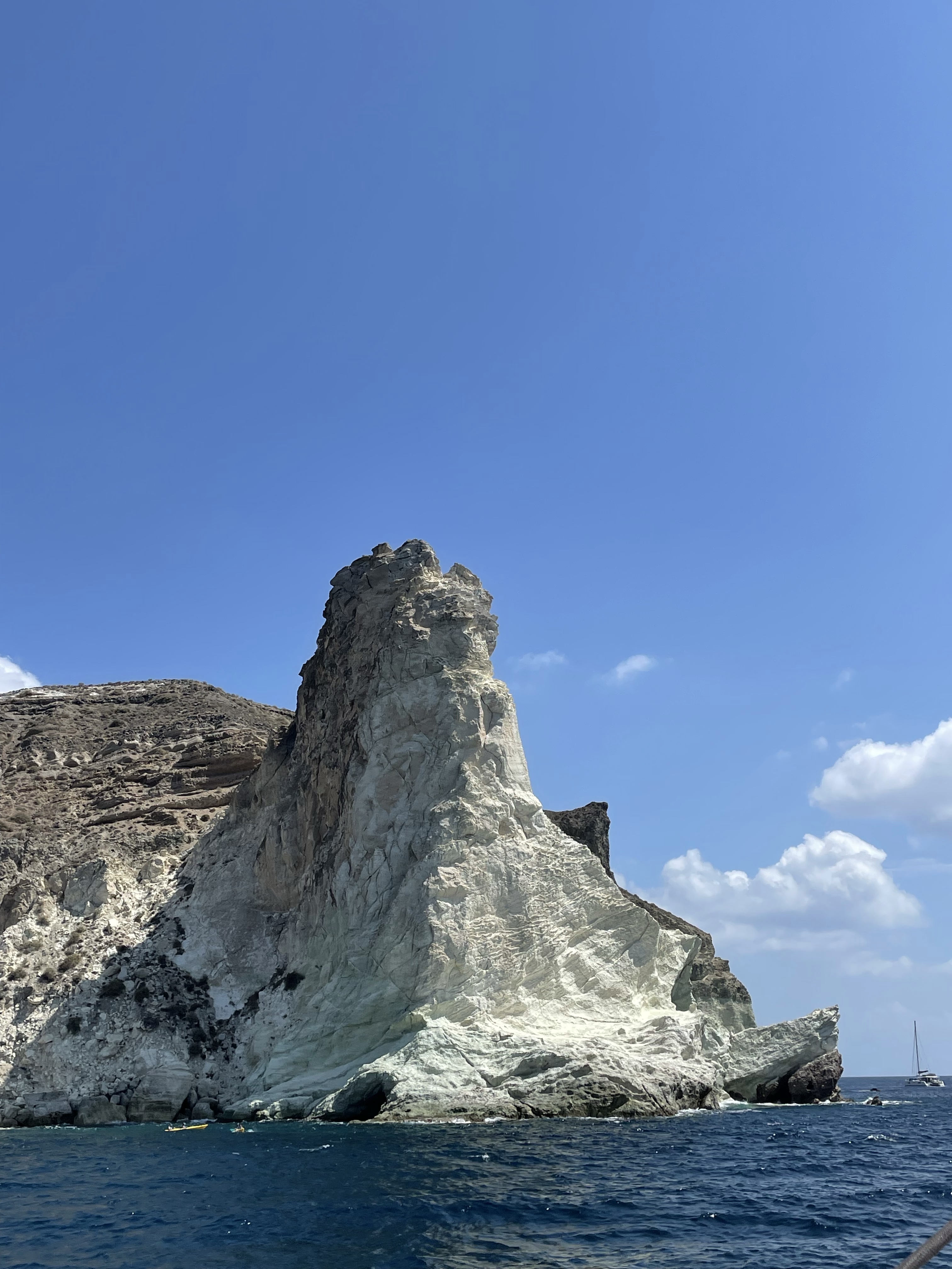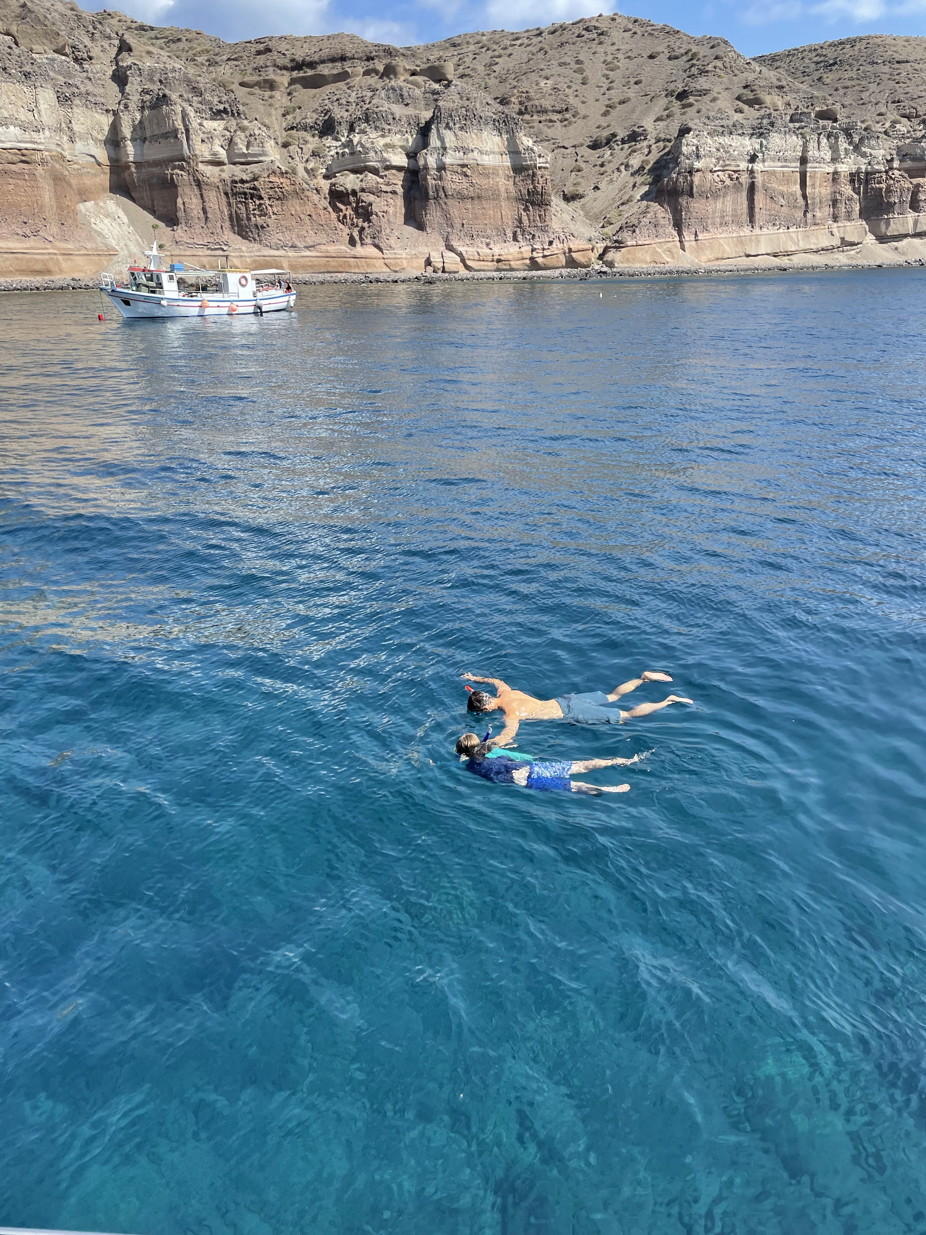 Our next day, our last full day in Santorini, we took another catamaran sailing cruise around the island. This cruise took us first to “hot springs” between a couple of the smaller islands that comprise Santorini. While I can agree the water was warm…it was far from hot. As Josh said, they probably couldn’t market it as warm springs so… I’ve experienced hot sprints in the Atacama desert in Chile and also in Costa Rica. I guess when they are in the sea it is hard to heat the larger bodies of water the same way. It was a cool experience though. The next stop was near one of the beaches of Santorini, which has a black beach, a white beach, and a red beach. This second stop was near the white beach and they cooked lunch there while some snorkeled. We were not close enough to go to the shore but it was interesting to see. The last stop was just off the cost of the red beach which technically is closed because of the risk of rock slides. You wouldn’t know it by all the people hiking down to it though.