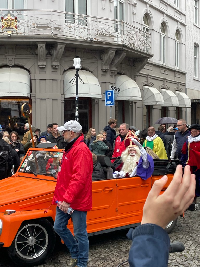 Officially, Sinterklaas arrived in Maastricht in mid November. He comes by boat, then parades through town sometimes by horse, but in our case this year, by car. It is a super festive day, with families out on the sidewalks singing songs and hoping for candy to be handed out by the Piets (the controversial helpers). Then he travels around to other cities.