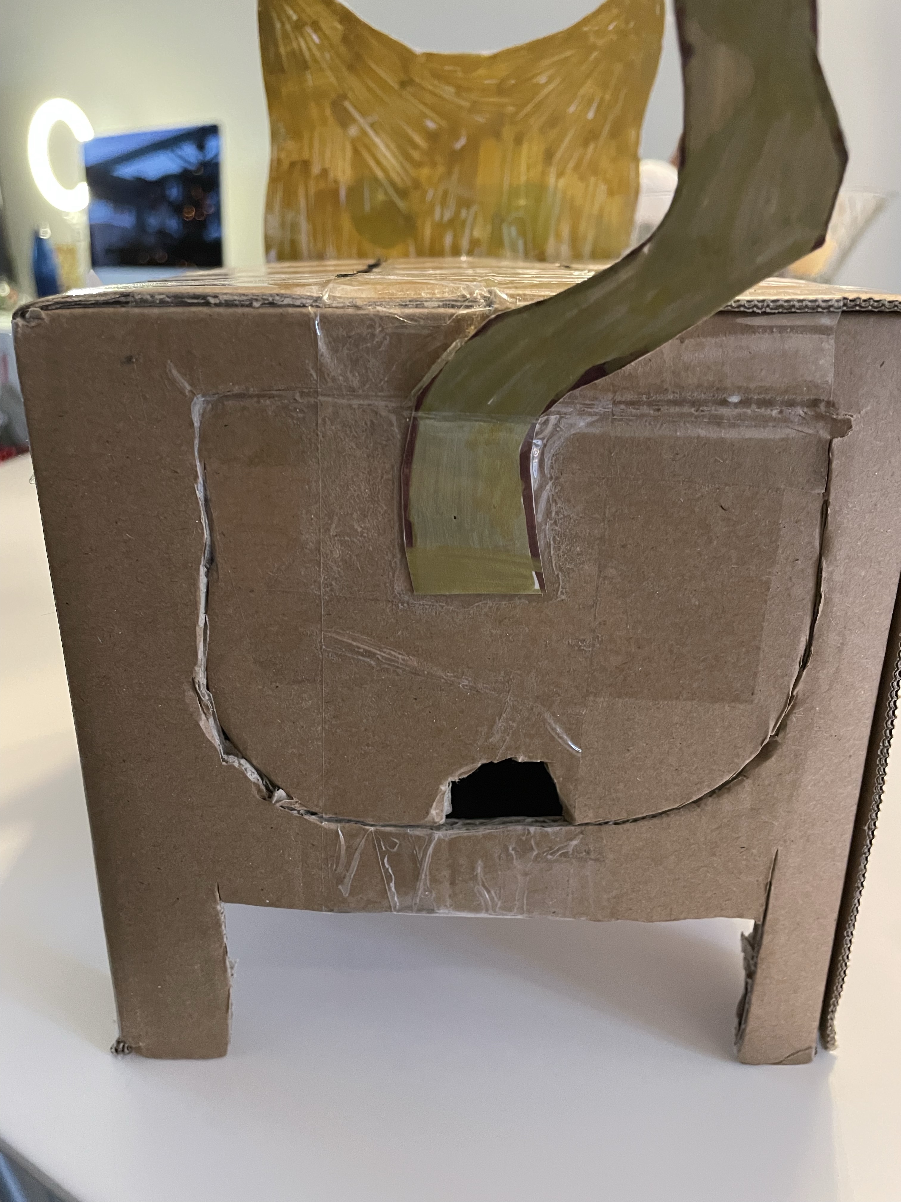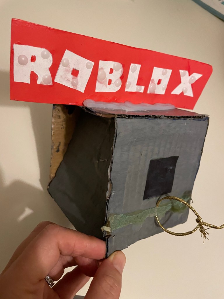 Caleb received a Robux gift card wrapped inside something really Roblox-y. While Mason received a game of Phase 10 (a game we love!) inside the most creative cat box (where the gift came out his butt! hah!) and there was a a cat vs. dog game of tic tac toe on the top.
