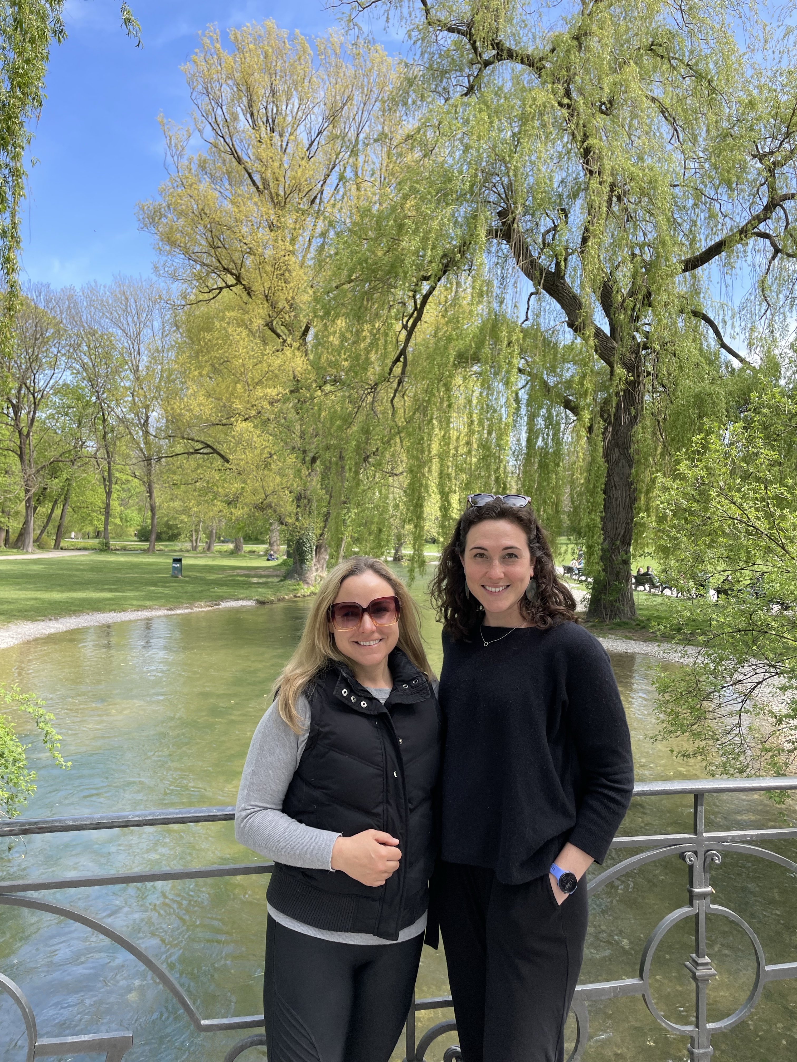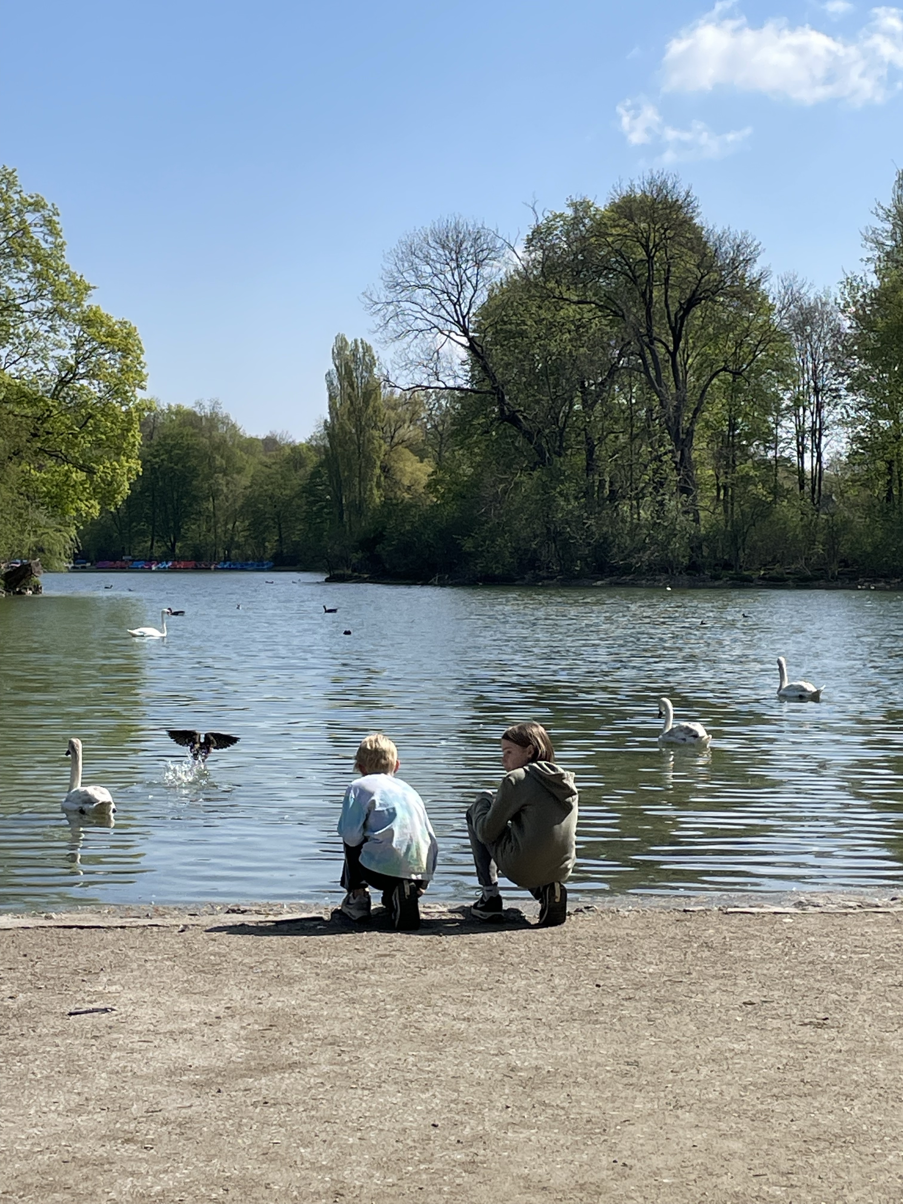 - English Garden. Aside from seeing Maggie, one of the places I wanted to see was the English Garden (“Englischer Garten”). Luckily, we could walk to one part of it from our hotel and that’s where we went after checking in, eating a light breakfast, and freshening up a bit. The English Garden is massive…I think 4 times the size of NYC’s Central Park. There are many winding paths, green grassy areas, wooded sections, the Isar river flowing through it. There’s even a section called the Eis Bach (“ice bath”) and there are surfers in one part of that! The first day, we met Maggie at a small playground on the edge of the garden where the boys played and we got to catch up a little with her. We chatted and walked through what felt like a large section of the garden, but was really just a small portion of the park before making our way to Lunch at Kaisergarten, and making tentative plans for the next few days.
