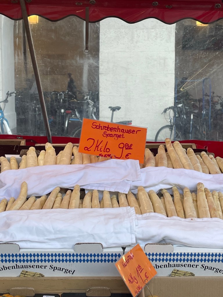 - Marienplatz (“Mary’s Square”). According to Wikipedia, this square has been the main square of Munich since 1158. Here is some great people watching of vendors, tourists, and locals making their way through, and there were some cute cafes on the edges that looked lovely. The gothic style Neues Rathaus (New City Hall) is here with its Glockenspiel (basically like a massive cuckoo clock that still operates on select hours of the day) , there’s a large column monument to Mary, and this plaza also hosts the Christmas market – I bet that is pretty spectacular. We spent time walking around here, just taking in the sights. One day I also bought some fresh strawberries for Mason, but the main product on sale everywhere was the white asparagus.